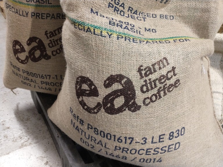 Coffee Sacks. Those beautiful jute or hessien sacks we buy our coffee in – we get 100s a year so if you want some for upholstering, a craft project, your allotment carpet or anything else we have plenty available.